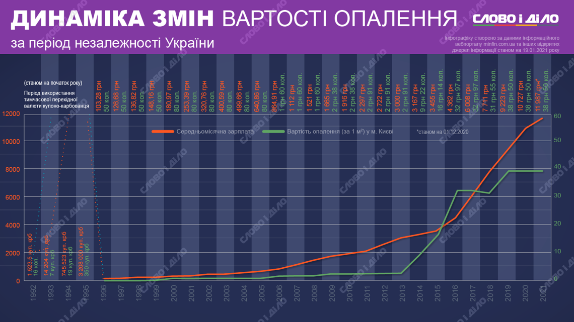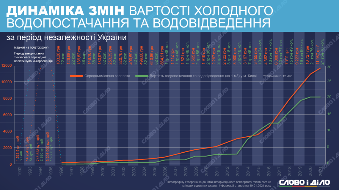 «С 2014 года тарифы на водоснабжение выросли почти на треть, на электроэнергию — в разы, на газ для домохозяйств — в десятки раз. У многих людей просто нет денег, чтобы оплачивать коммунальные услуги, им приходится буквально выживать».Разумеется, тарифы сильно выросли; Украина избавляется от наследия социалистической экономики, при которой энергия доставалась населению чуть ли не бесплатно, что приводило к ее бесконтрольному расходу. Но говоря о росте цен, Путин умалчивает о росте зарплат. А сравнительные графики уровней тарифов и размеров средней зарплаты, опубликованные украинским изданием «Слово i дiло,» весьма красноречивы.