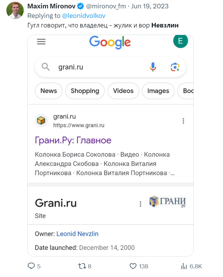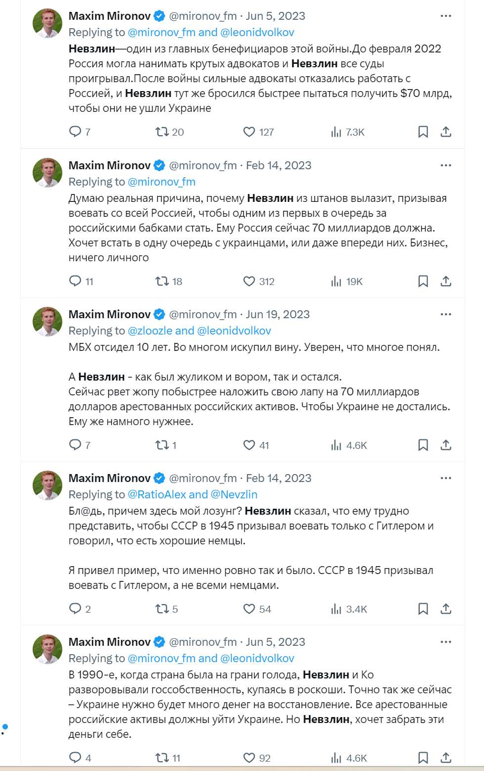 Максим Миронов — экономист, близкий к команде Навального, переехавший в Аргентину. В своем Twitter он часто критикует Невзлина, называя его «жуликом и вором».