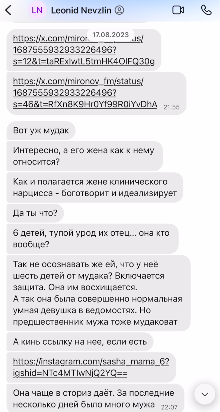 1. В переписке цитируется диалог в Signal между Невзлиным и Певчих, который мог быть только у тех, кто имеет физически доступ к гаджетам либо Невзлина, либо Певчих. Даже если бы кто-то взломал аккаунт Невзлина или Певчих, он не получил был доступа к сообщениям — для этого нужен физический доступ к гаджету.
