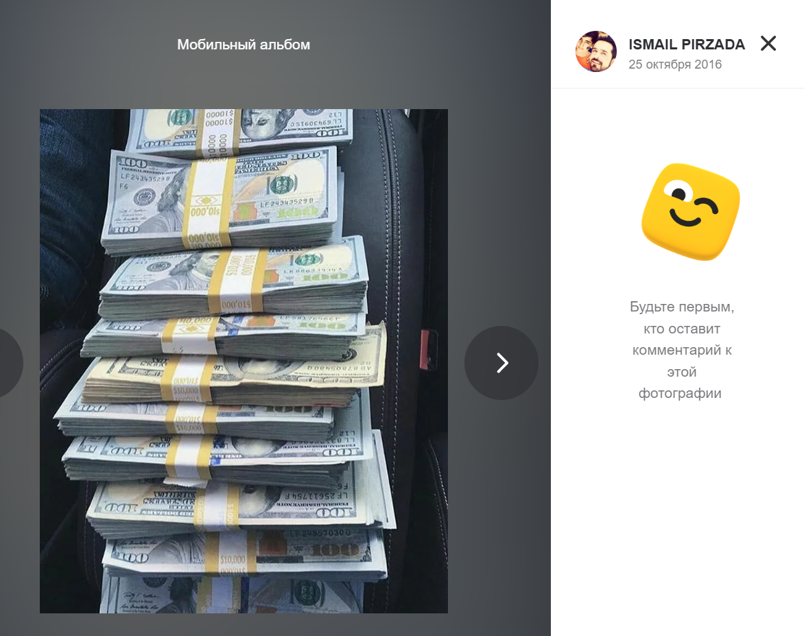 В тот же день, 26 октября 2016 года, один из участников этого застолья — Исмаил Пирзада — опубликовал в «Одноклассниках» две фотографии с пачками долларов, где, судя по объему, было примерно $100 тысяч.