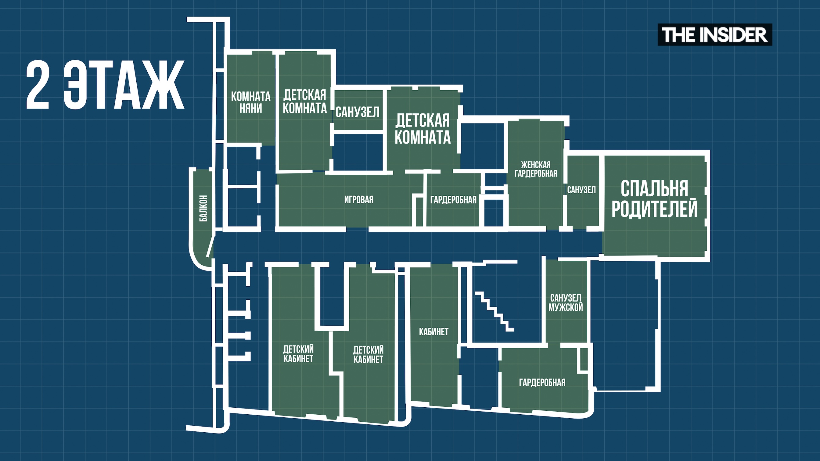 Главная спальня площадью 75 кв. м находится на втором этаже, куда можно попасть по шикарной винтовой лестнице. Рядом со спальней располагаются две гардеробные для Костина и Аскер-Заде и две отдельные хозяйские туалетные комнаты. Также тут есть двухметровое помещение под названием «хранилище украшений» и кабинет хозяина. На втором этаже находятся и две детские комнаты, два детских кабинета и отдельно — игровая комната. Над бассейном расположен спортзал площадью почти в 170 кв. м.