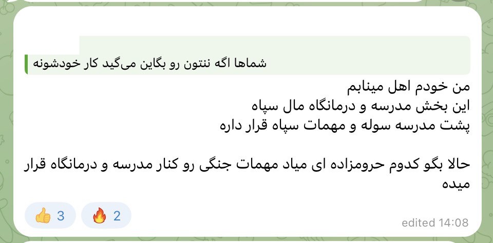 Местный житель 5 — студентка отделения акушерства в Бендер-Аббасе также признает связь школы с КСИР. Ее аккаунт зарегистрирован в июле 2024 года, состоит в 30 группах. В августе 2025 года она писала, что учится на бакалавриате в Бендер-Аббасе и не живет в общежитии. Она подтвердила тот же ключевой факт: школа была благотворительным учреждением, основанным ВМС КСИР. Ее пост — ответ на утверждение, что власти сами обстреляли школу: