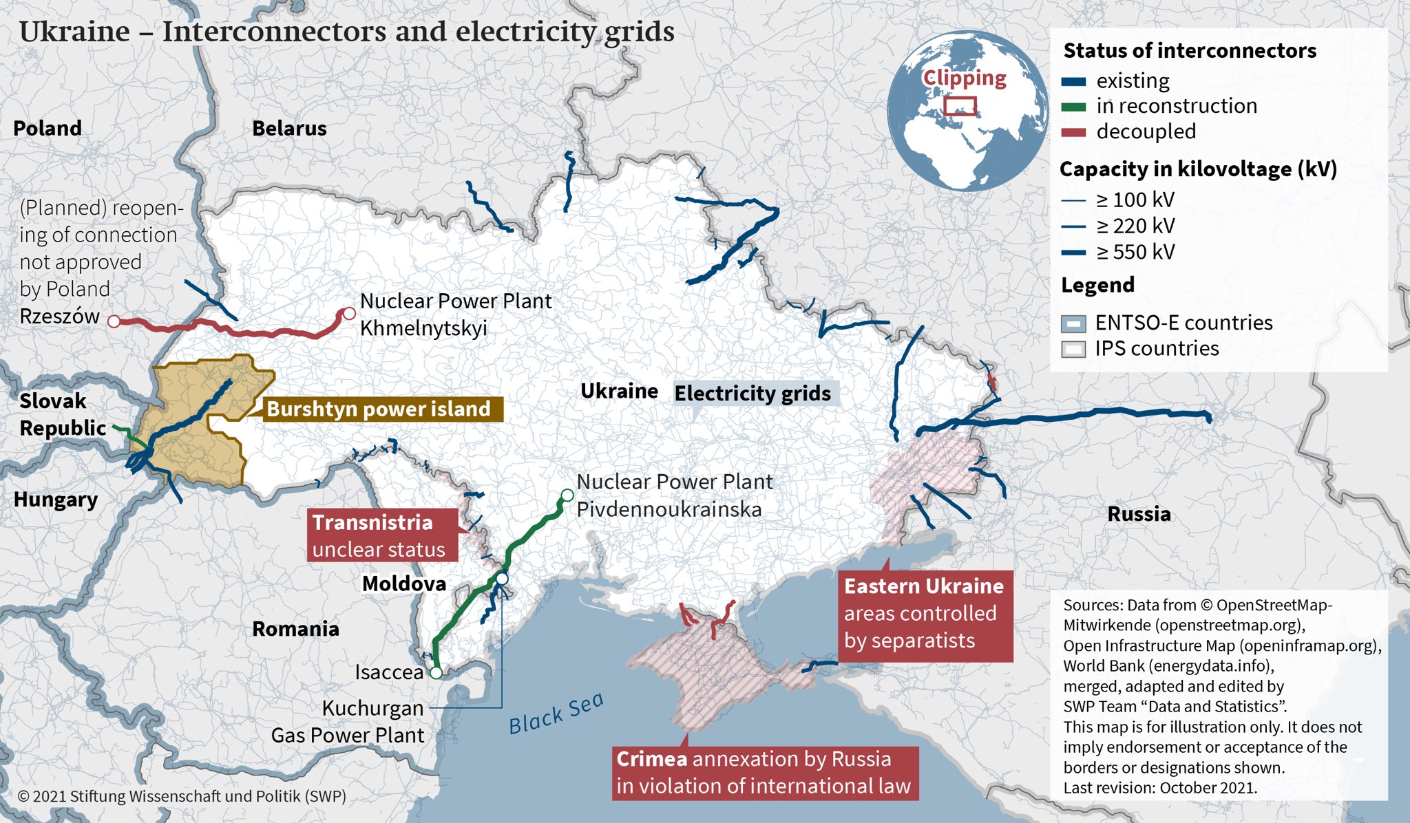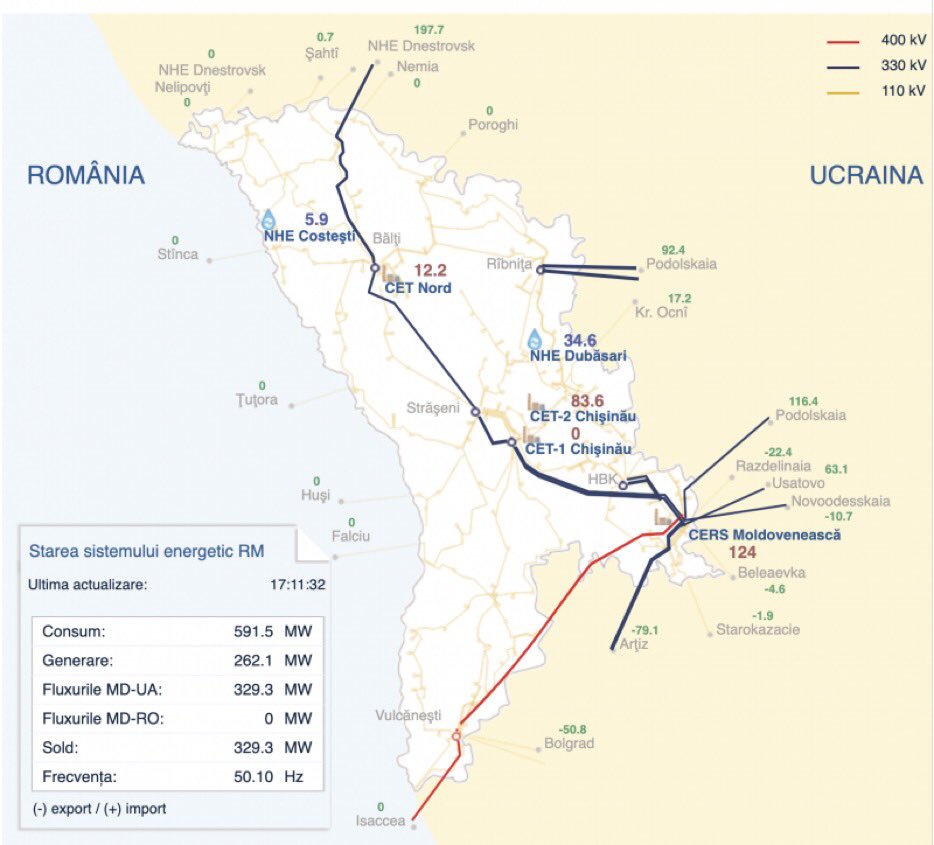 Карты, иллюстрирующие электрические соединения Украины и крупный план соединений через Молдову: