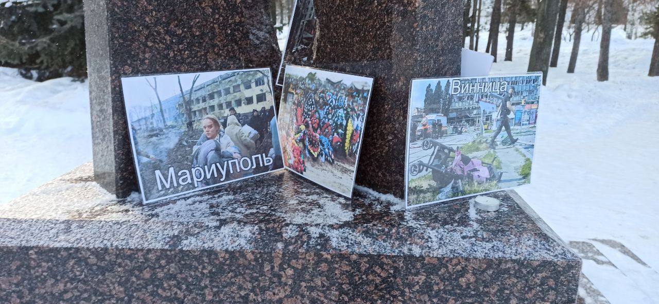 Активисты выступили против войны и в Ханты-Мансийске, к мемориалу возложили цветы и положили плакаты с антивоенными надписями.