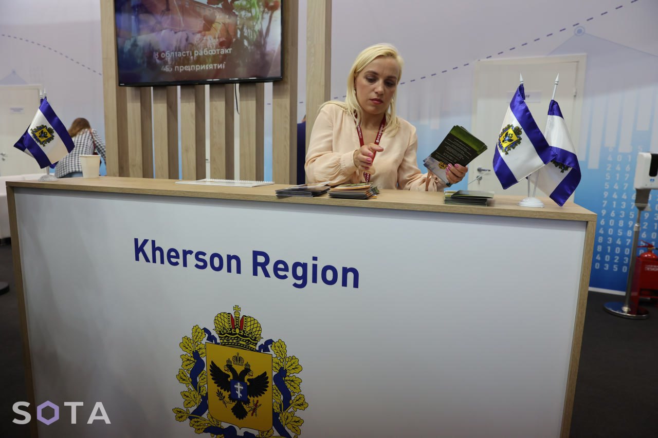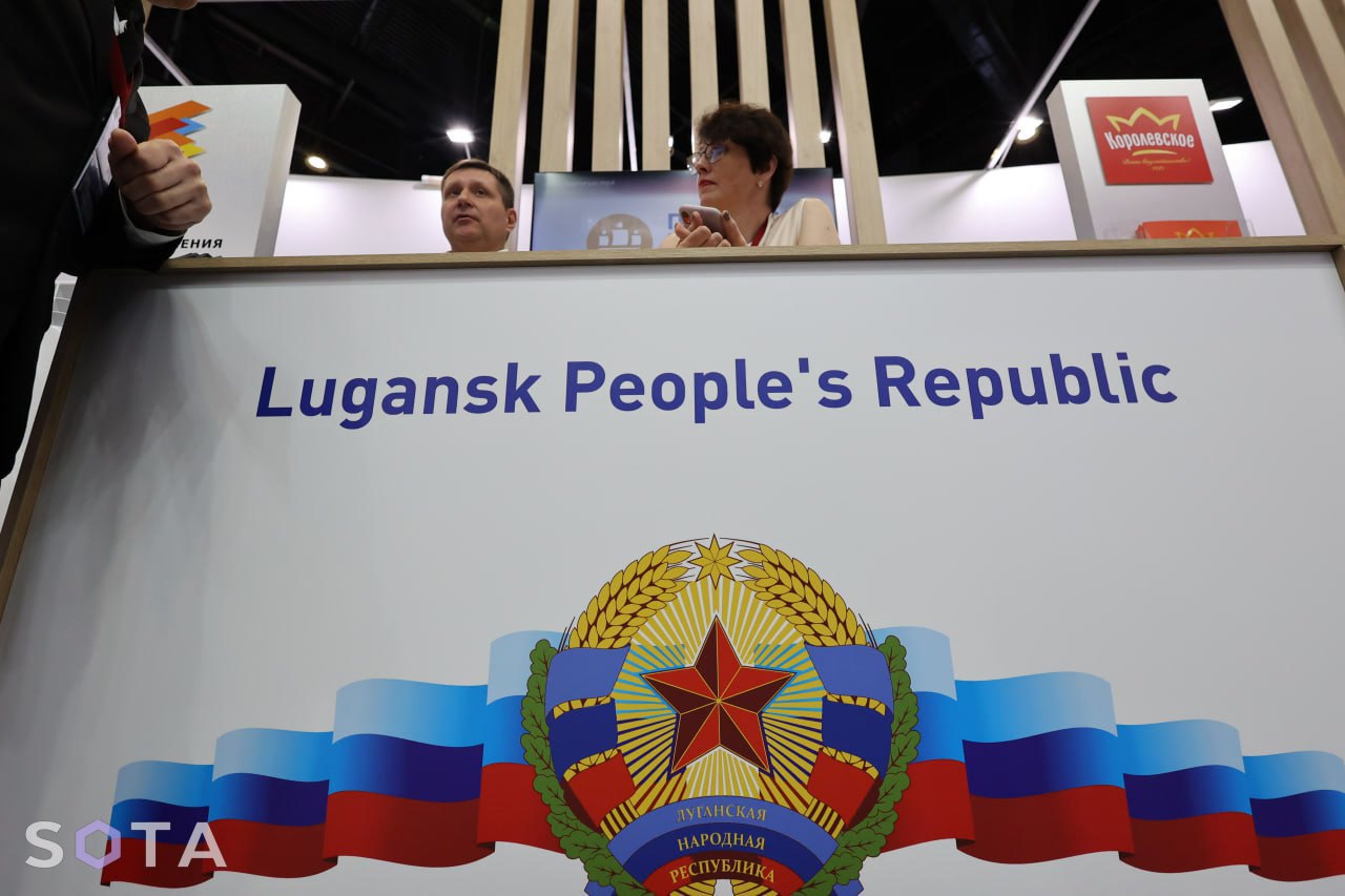 На ПМЭФ можно увидеть также стенды аннексированных Россией регионов. Так, Запорожская область предлагает сыр «Российский» и черешню, министр культуры, спорта и туризма аннексированного региона Радик Исякаев лично раздает коробки с «Мелитопольской черешней», «выращенной в России». При этом столы Херсонской области, «ДНР» и «ЛНР» стоят с информационными буклетами.