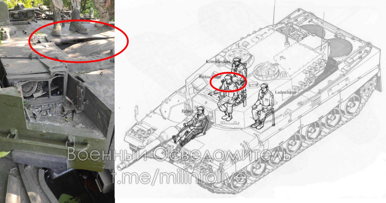 Появилось фото поврежденного танка Leopard 2A4. Отмечается, что его башня пробита ровно над местом наводчика, который, вероятно, погиб в результате удара, если находился на нем. Кроме того повреждены панорамный прицел командира PERI R17 и прицел наводчика EMES-15.