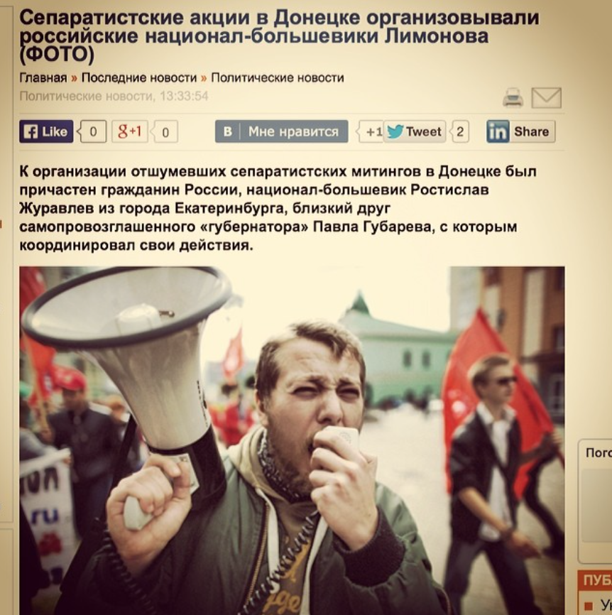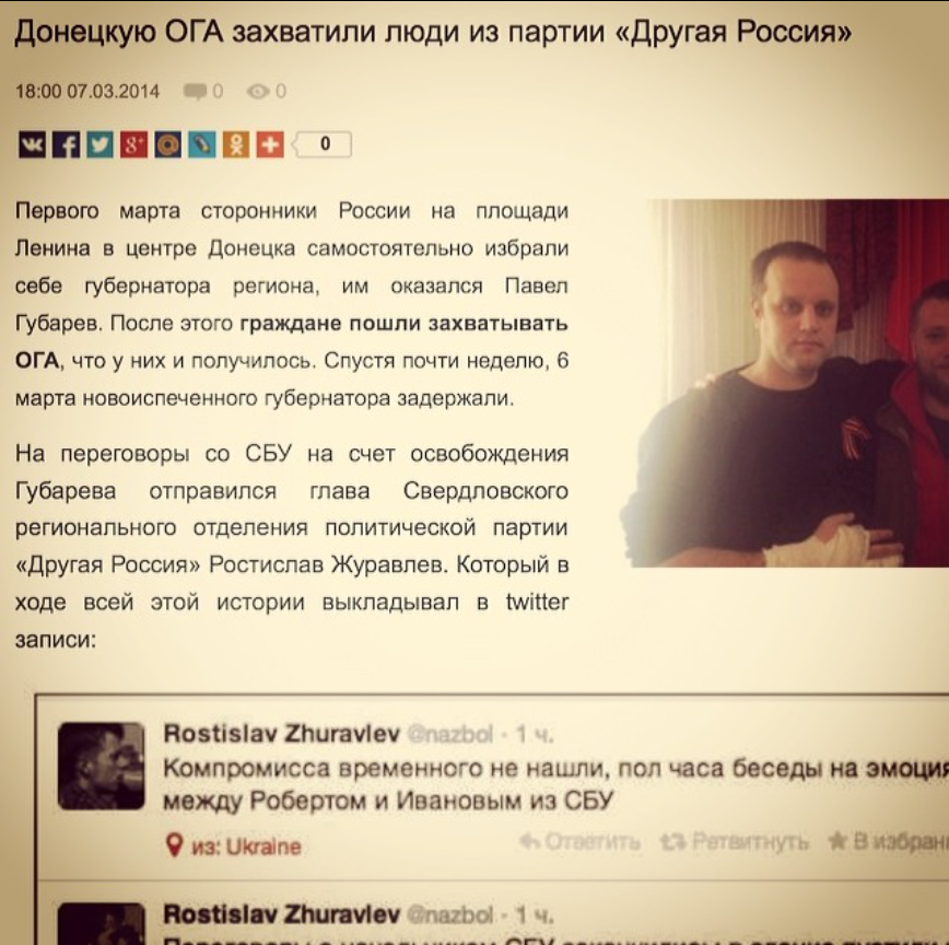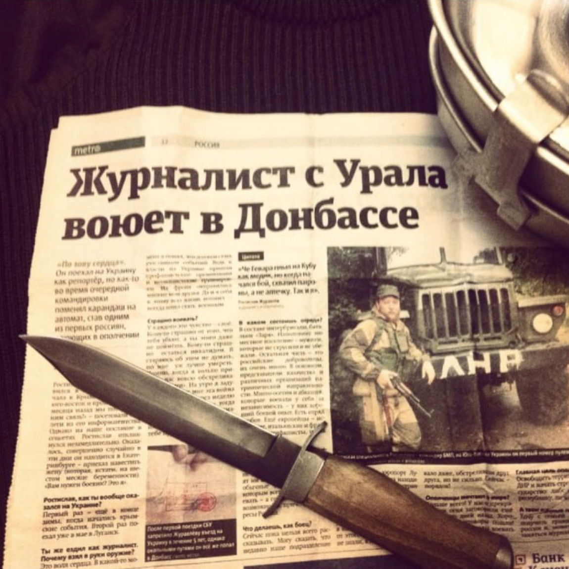 Также Журавлев публиковал газетные вырезки, где у него берут интервью и рассказывают о «военных успехах». Например, судя по новостям в СМИ, Журавлев принимал участие в захвате Донецкой ОГА. В интервью же он рассказывает, как будучи журналистом, захотел «поучаствовать» и поехал на восток страны истреблять пресловутые «неонацистские группировки». Материал от сентября 2014 года дан с заголовком «Журналист с Урала воюет в Донбассе — он поехал на Украину как репортёр, но в одну из командировок поменял карандаш на автомат, став одним из первых россиян, воюющих в ополчении».