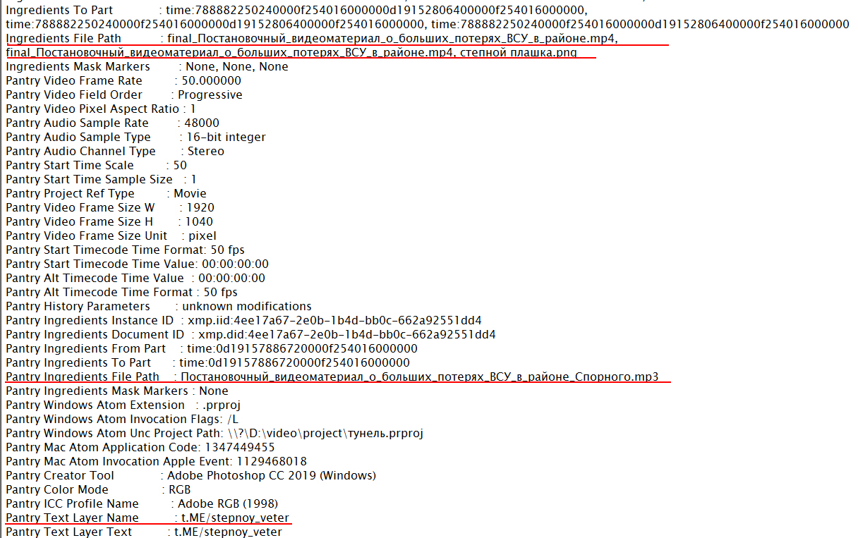 «Военкор» Алексей Акутин опубликовал видео взятого российскими военными опорного пункта ВСУ, в котором якобы оставлены тела украинских военных. Однако если заглянуть в EXIF, то можно увидеть, что файл хранился в папке с названием «Постановочный видеоматериал о больших потерях ВСУ».
