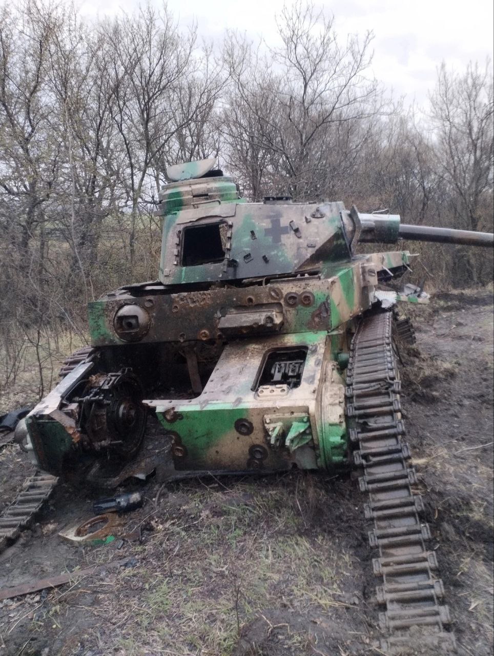 Появилась фотография немецкого Pz. Kpfw. IV Ausf.F2 времен Второй мировой войны на гусеницах от БМП-2 под Кременной. Z-канал «Военный Осведомитель» предположил, что ВСУ использовали танк в качестве ложной цели — приманки для дронов-камикадзе.