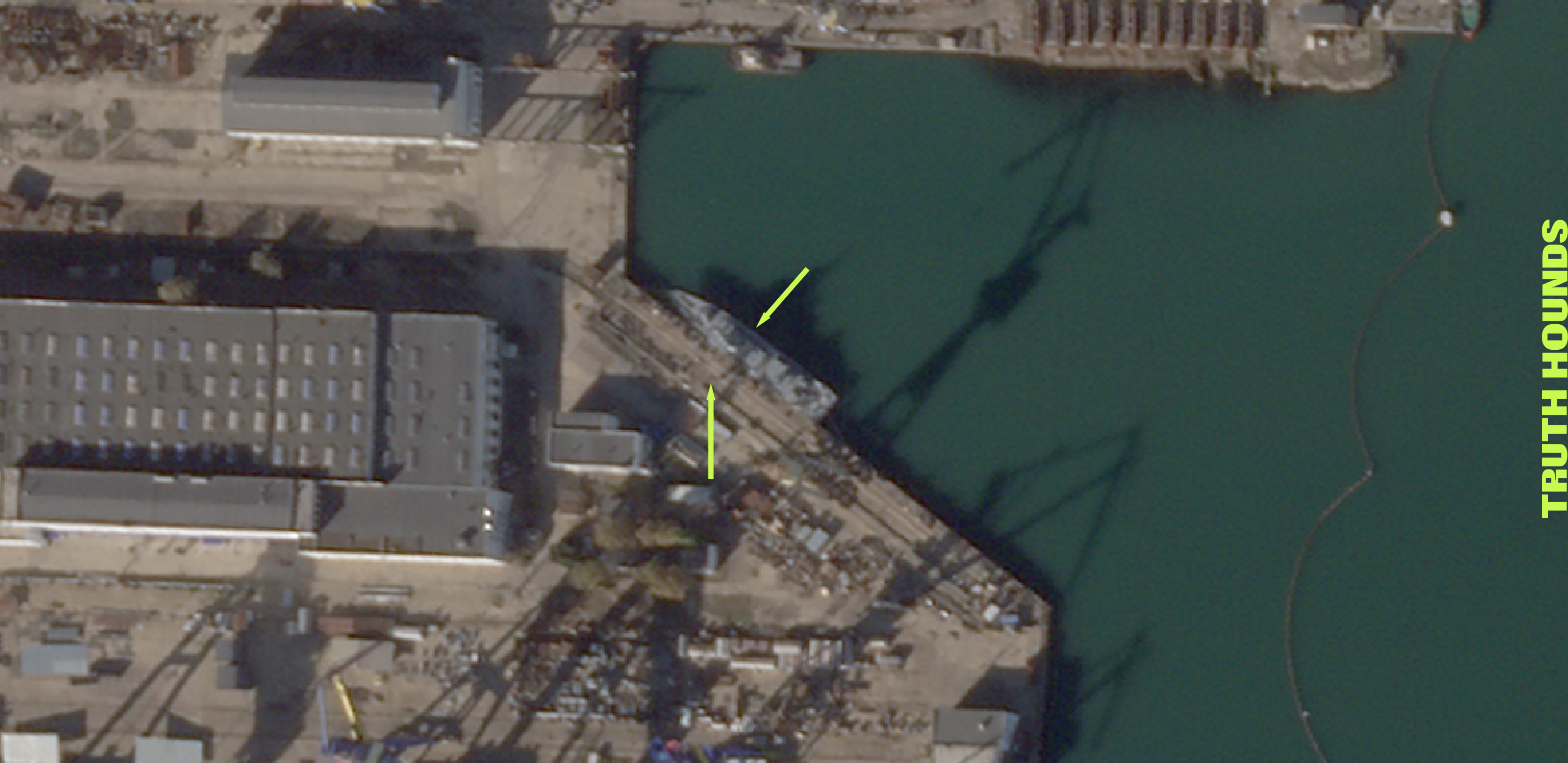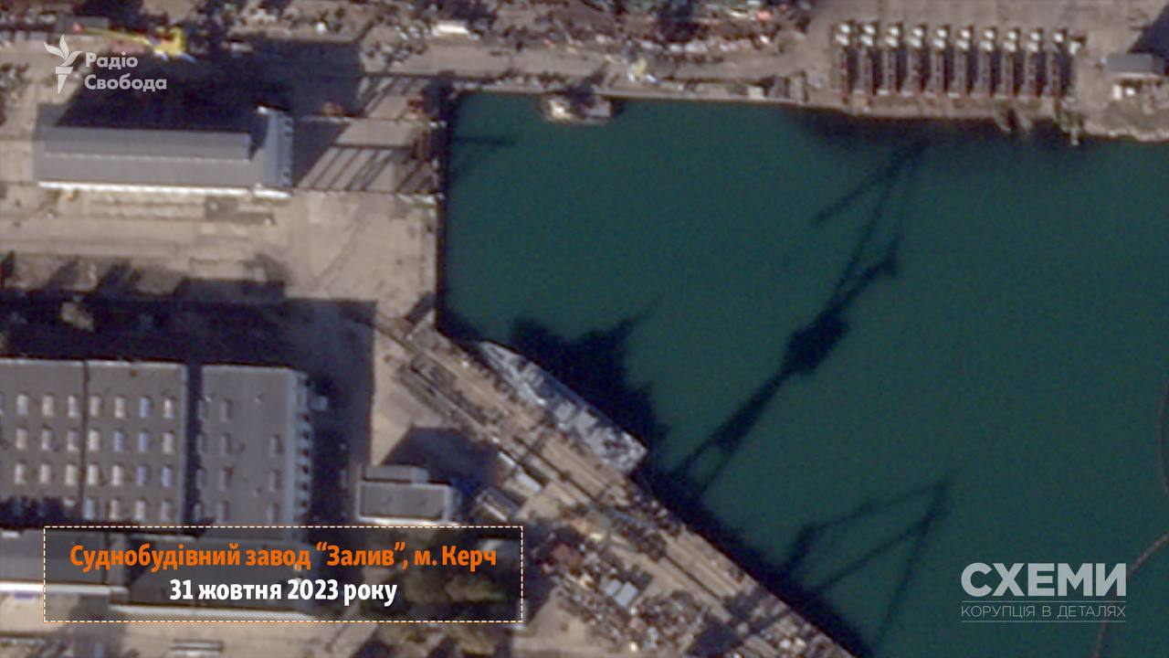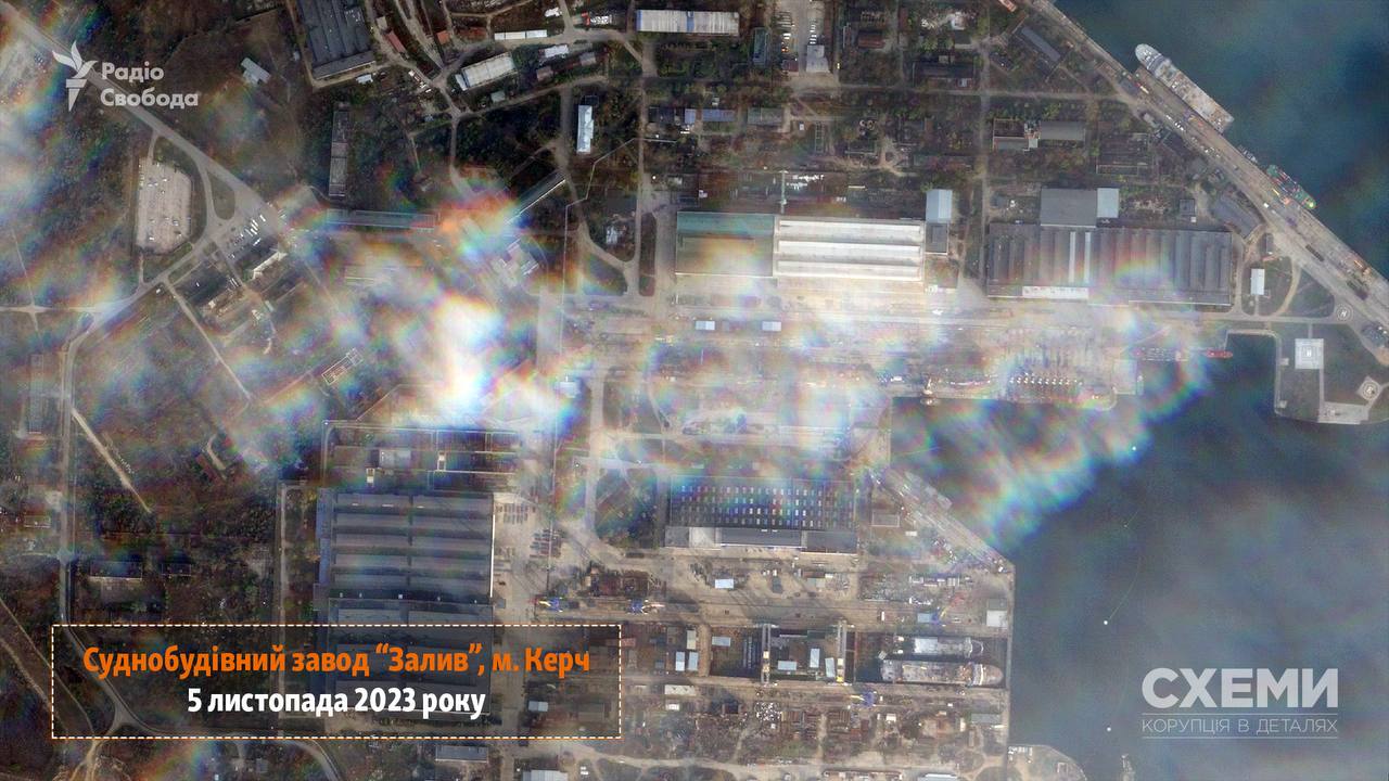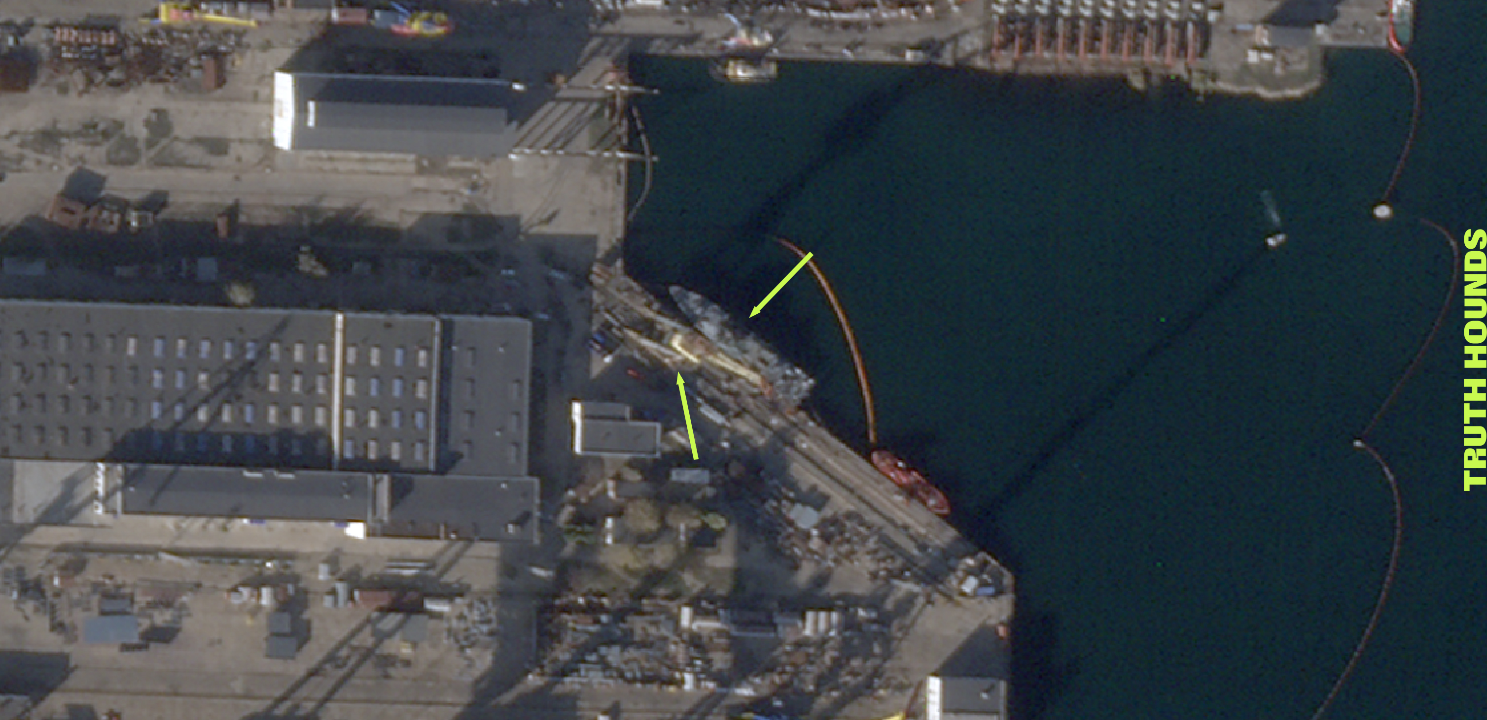 Проект Truth Hounds также публикует спутниковые снимки доков завода «Залив». На снимках за 5 ноября видно, что произошло как минимум одно попадание по кораблю, а для ликвидации последствий перемещен один кран.
