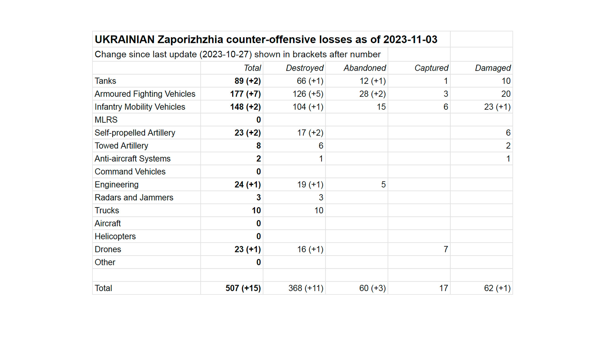 Аналитик под ником Naalsio обновил подсчеты потерь вооружений и военной техники ВСУ и ВС РФ на запорожском направлении, где в последние пять месяцев развивалось украинское наступление. По его данным, за это время ВСУ потеряли не менее 507 единиц техники (474 без учета беспилотников и грузовиков), ВС РФ — 585 единиц (479 без учета беспилотников и грузовиков). За неделю подтвержденные потери техники составили 15 единиц для ВСУ и 28 для ВС РФ.