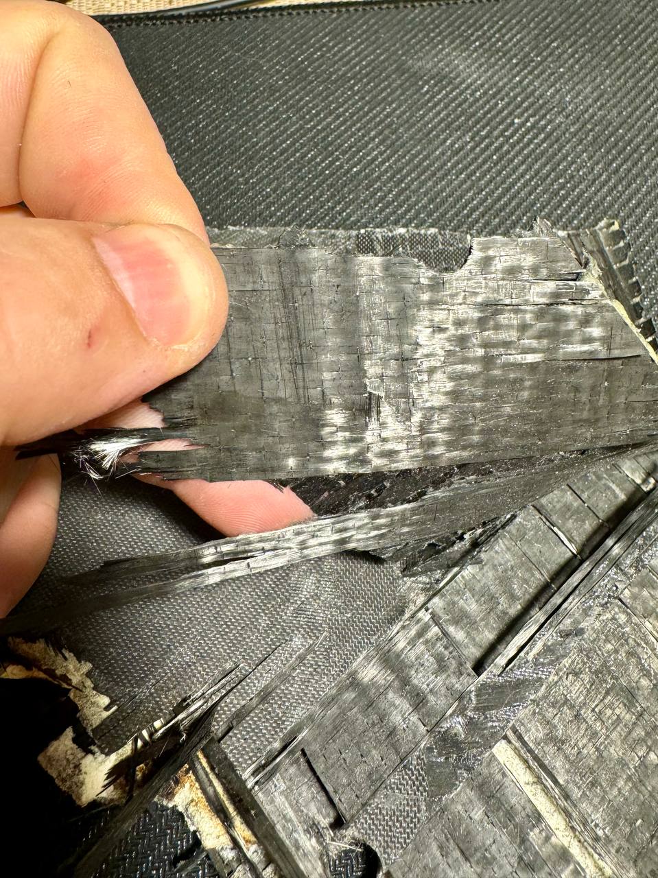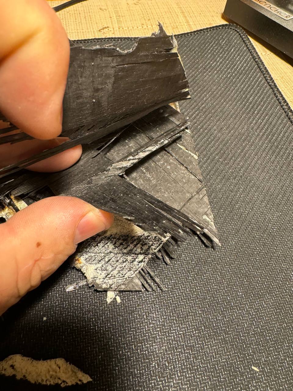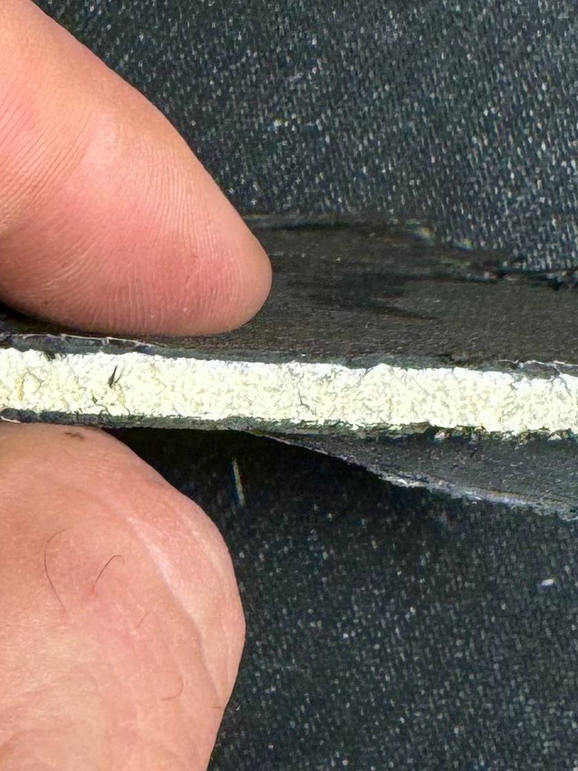 «Толщина пирога 6 мм. Сверху и снизу черный слой толщиной 1 мм, а внутри светлый наполнитель толщиной 4 мм. Наполнитель похож на очень плотный пенополистирол. А черные слоя это что-то похожее на стеклоткань пропитанную эпоксидкой <авторские орфография и пунктуация сохранены — The Insider>».