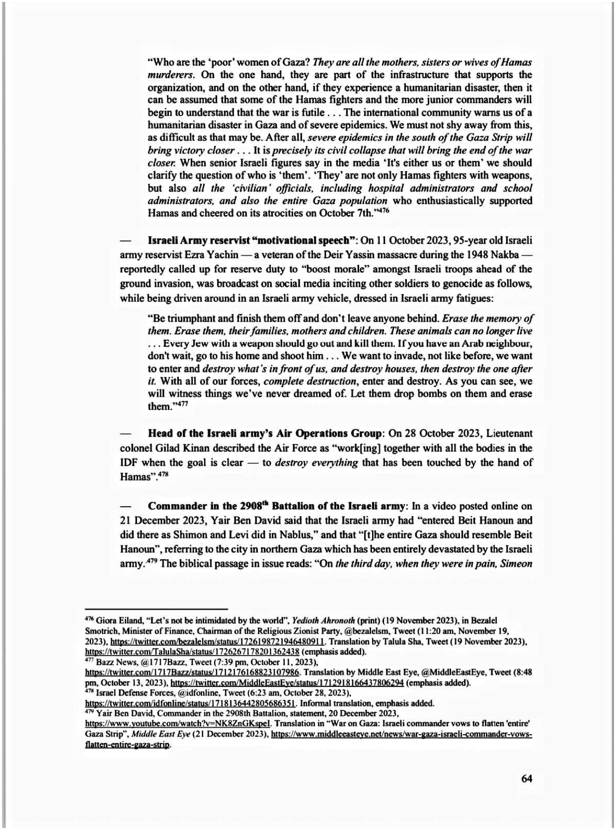 Наконец, всё это делается под лозунгами, доказывающими геноцидальный умысел: „Мы воюем с Амалеком”, „В Газе нет невинных людей”, „Дети Газы сами навлекли на себя это”, „Мы уничтожим Газу”, „Мы уничтожаем человекоподобных животных” и т.д. Всё это высказывания руководителей Израиля: от президента и премьер-министра до министров и членов Кнессета. Еще больше этого мы слышим от беснующихся израильских военных, хвастающих своими „подвигами” в многочисленных видео. Кроме того, должностные лица Израиля вслух говорят о намерении „освободить” Газу от населяющих ее палестинцев. Если всё это не геноцид, то что такое геноцид?