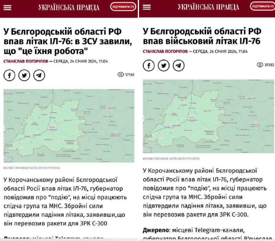 В «Украинской правде» поменяли соответствующий заголовок, оставив утверждение о транспортировке на борту ракет С-300, которыми обстреливают Харьков. Так же поступило издание «РБК-Украина».