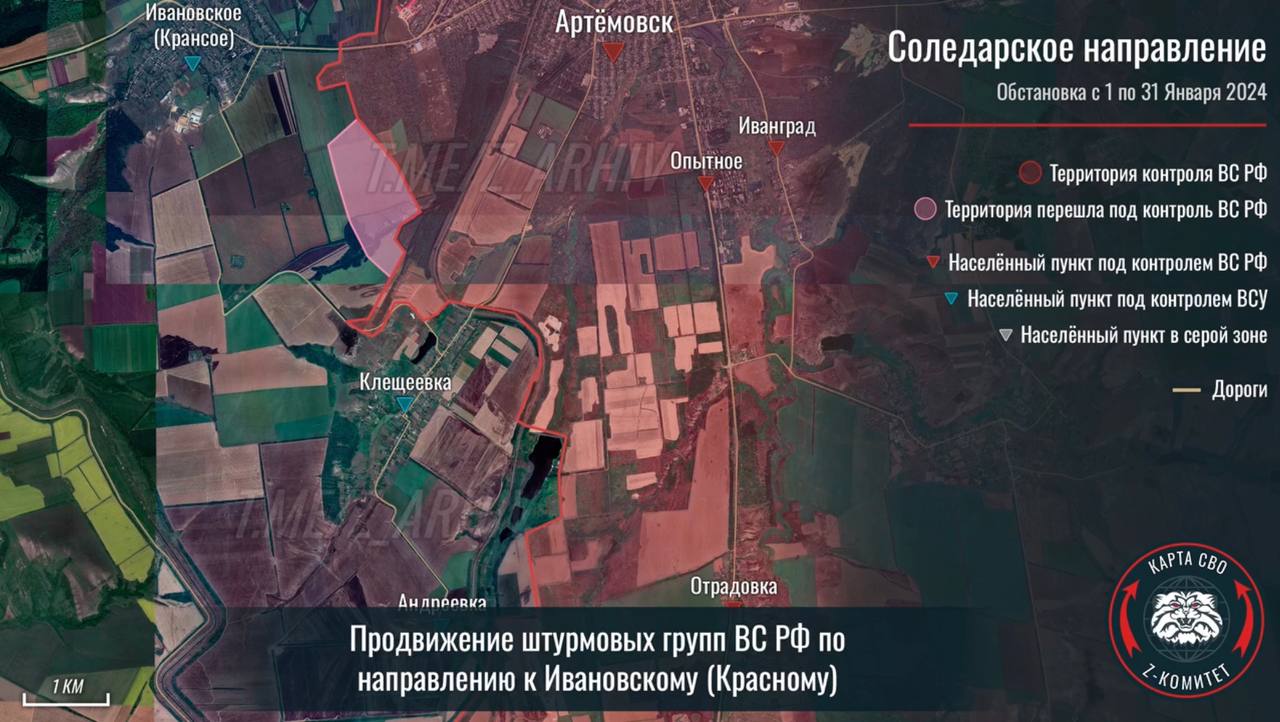 Z-канал «Осведомитель» опубликовал подборку инфографики с продвижением ВС РФ за январь на основе интерактивной карты от пророссийского ресурса «Z комитет + карта СВО».