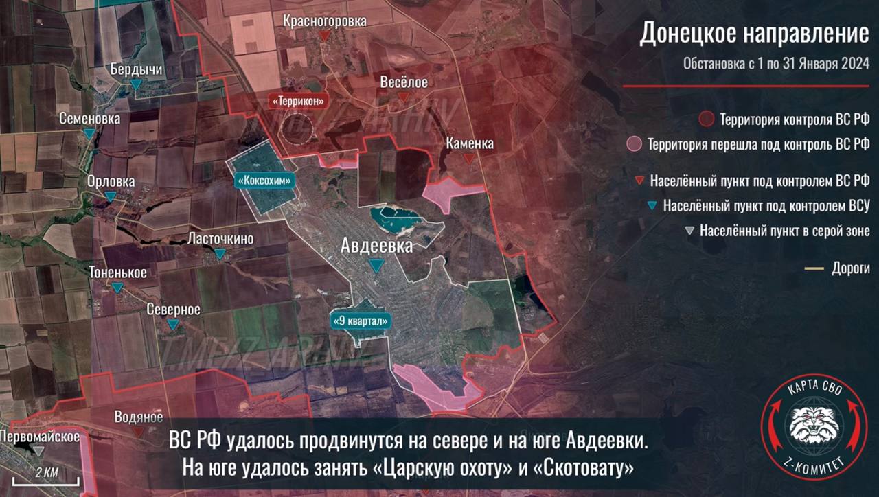DeepState обозначил на карте существенное продвижение ВС РФ на севере Авдеевки. Украинский журналист Юрий Бутусов пишет, что российским военным удалось закрепиться на одной из улиц, находящейся на северной окраине города. Он напоминает, что две недели назад ВС РФ зашли в город и с юга, и потому для его дальнейшего удержания необходимы свежие резервы и ротация в подразделениях, обороняющих Авдеевку. Кроме того, Бутусов отмечает нехватку боеприпасов и то, что нижестоящие командиры не хотят передавать плохие новости генералитету, таким образом вводя высшее командование в заблуждение.