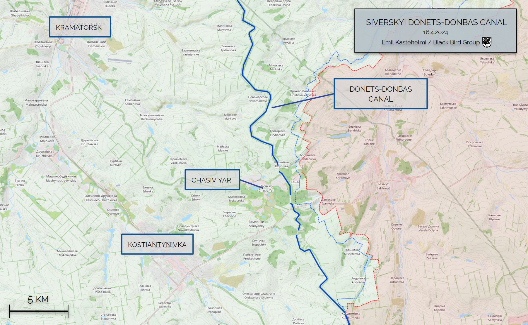 Аналитик Эмиль Кастехельми из OSINT-группы Black Bird Group публикует прогноз по возможному развитию наступления ВС РФ на Часов Яр. По его оценке, даже если российским военным удастся перейти через канал Северский Донец — Донбасс, за ним они столкнутся с несколькими линиями украинских ИФС. Помимо этого, в Часовом Яре есть и другие водные преграды, высотная застройка, а сам город расположен на возвышенности, что облегчает оборону.