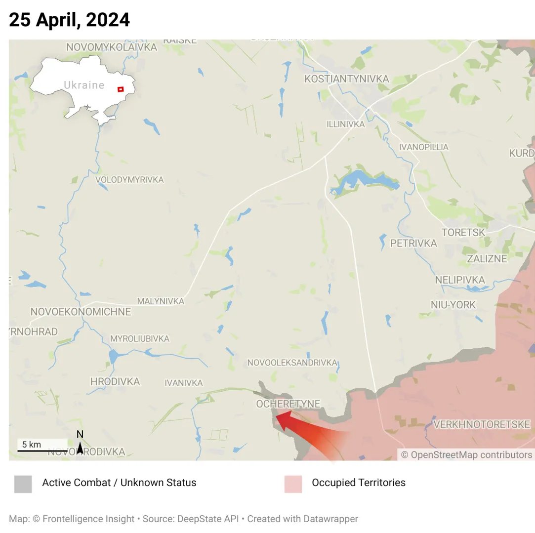 Исследователь Naalsio обновил данные по визуально подтвержденным потерям техники в Покровском районе (имеется в виду операционный район к западу от Авдеевки) и в районе Крынок на левом берегу Днепра. В Покровском районе, по его подсчетам, россияне за неделю с 19 по 26 апреля потеряли как минимум 25 единиц техники (в том числе 10 танков и 13 ББМ), подтвержденные потери техники ВСУ увеличились на 1 единицу. Под Крынками же подтвержденные потери сторон за тот же период составили 2 единицы техники для ВС РФ и одну — для ВСУ.