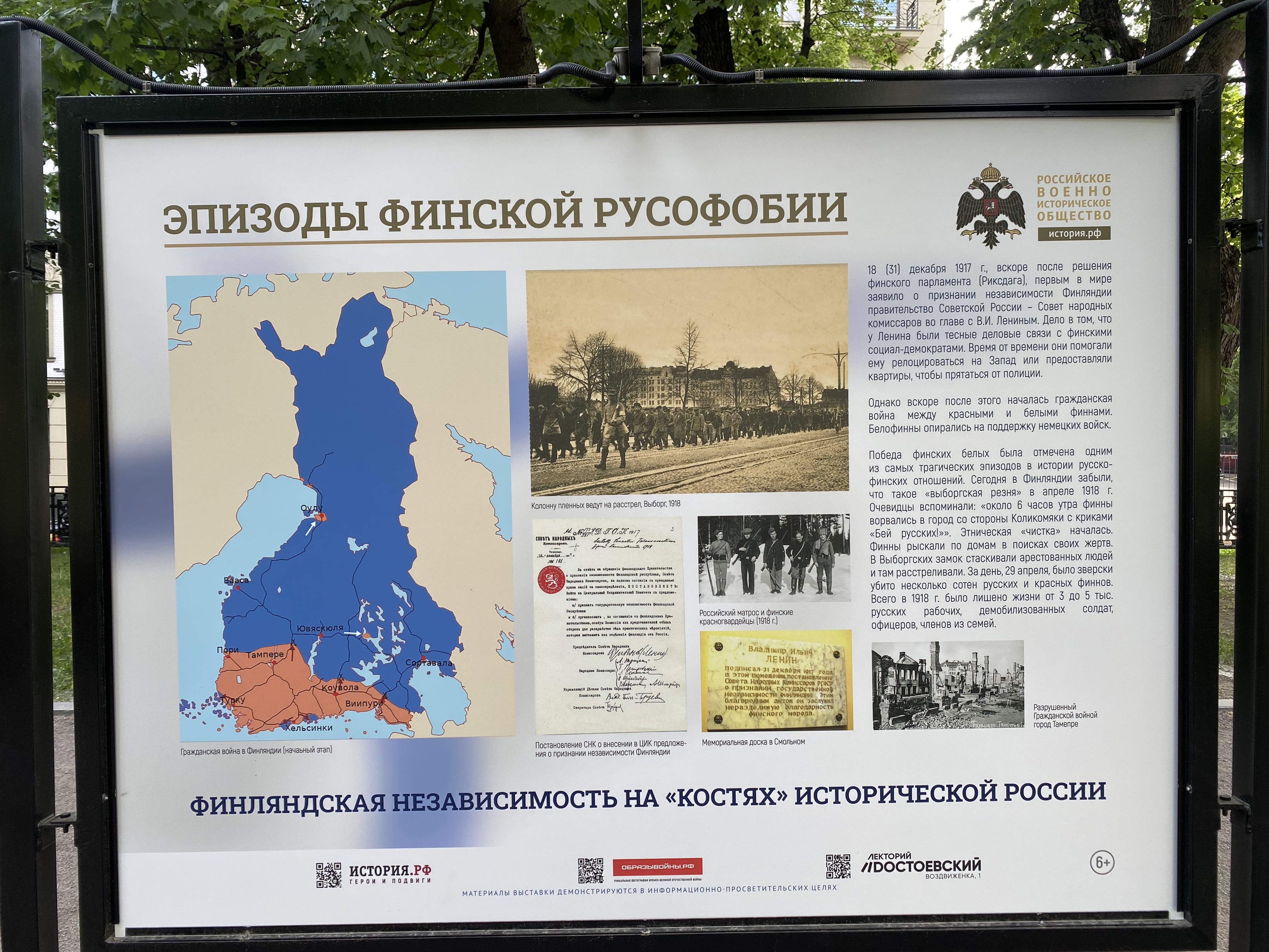 В Москве на уличных стендах проходит выставка Российского военно-исторического общества (РВИО) под названием «Эпизоды финской русофобии». В материалах выставки Финляндию называют «жалкой колонией Швеции», которая получила все права и свободы только после присоединения к России, а также рассказывают, что виновниками массовых расстрелов в Сандармохе были финны, а вовсе не НКВД.