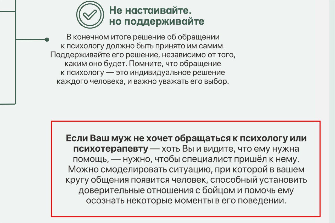 «Дайте ему время заново привыкнуть к дому, семье, детям. Постарайтесь дать ему пространство для переживаний, но не оставляйте его в полном одиночестве. (...) Он может спать в одежде и обуви, усиливать охрану двора, ставить решетки на девятом этаже. (...) Возможно, придется постепенно, день за днем, неделя за неделей налаживать физический контакт. Человек должен оттаять, привыкнуть к тому, что опасность миновала и удара в спину не будет. Не рекомендуется подходить к нему резко, со спины, лучше тихим голосом сначала заговорить, а потом приближаться и дотрагиваться. (...) Если нужно будет говорить что-то в ответ, задумайтесь, какую роль вы вложили в голос — учительницы, надзирателя или любящей жены», — говорится в памятке.