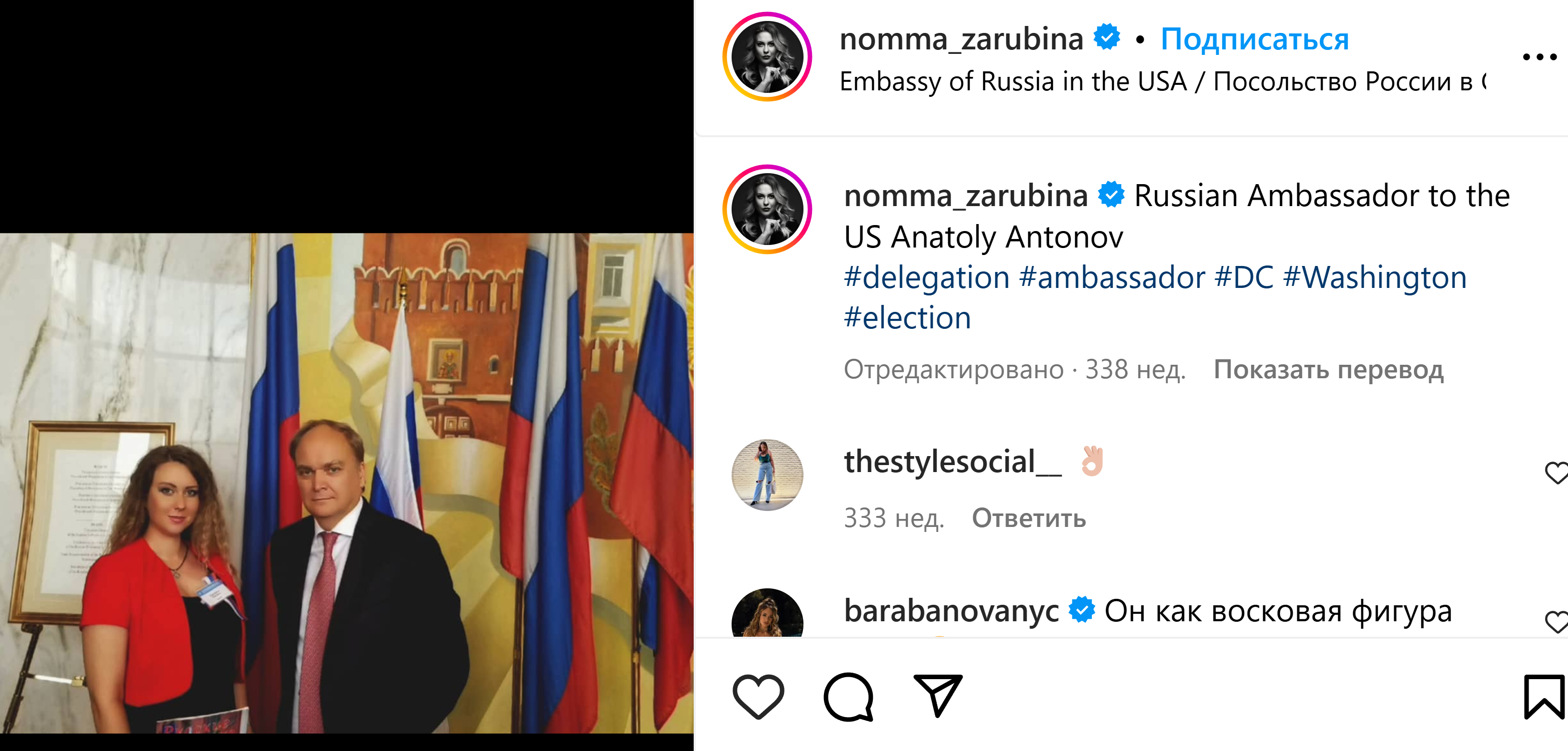 Номма Зарубина родилась в Томске в 1990 году, в Петербурге окончила СПбГУ (изучала «геополитику»), затем магистратуру РАНХиГС по теме «международная безопасность» и эмигрировала в США в 2016 году. В Нью-Йорке она вышла замуж за американца, родила ребенка и начала работать в местном Российском культурном центре (RCNY), где отвечала за организацию мероприятий (таких как, например, патриотическое шествие «Бессмертный полк»). Этот центр был основан россиянкой Еленой Брэнсон, ранее возглавлявшей Координационный совет организаций российских соотечественников (КСОРС) в США — формально независимой, но де-факто подведомственной МИД РФ (о том, как КСОРСы стали инструментом кремлевской пропаганды, The Insider уже писал). Брэнсон даже стала крестной матерью дочери Зарубиной. А потом к Брэнсон нагрянуло ФБР, обвинив ее в том, что она работает без регистрации в интересах российского правительства и получает задания и финансирование от высокопоставленных российских чиновников. Брэнсон немедленно ретировалась в Россию, где стала звездой кремлевского телевидения, а Зарубина осталась жить в США, хотя до 2022 года продолжала летать в Россию (в том числе и после начала полномаcштабного вторжения).