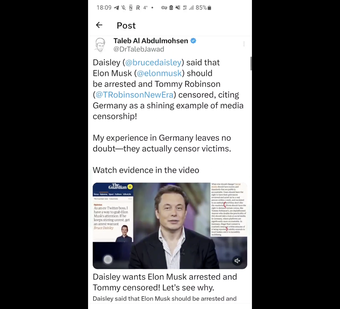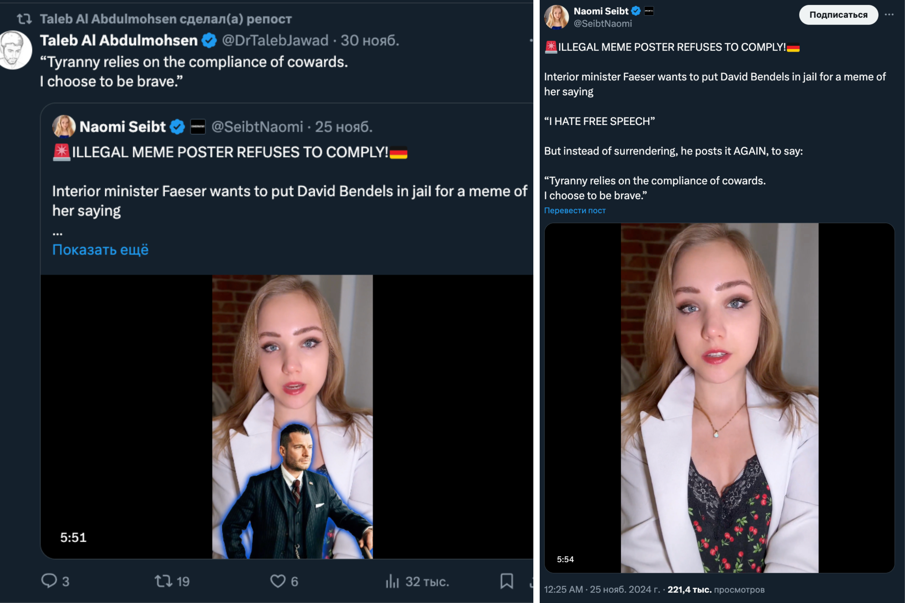 Свою последнюю публикацию аль-Абдулмохсен сделал сам — он снова опубликовал старую запись о том, что бывший топ-менеджер Twitter Брюс Дейсли требовал арестоватьИлона Маска, к записи добавлено видео с «реакцией» самого Маска на это заявление. В действительности реакция Маска — это дипфейк. Аль-Абдулмохсен пишет, что Маска сделали жертвой цензуры. Эту запись он сделал через несколько часов после публичного заявления Маска о том, что «только АдГ может спасти Германию».