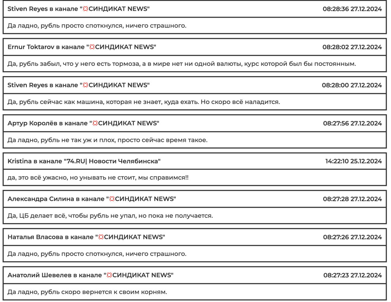 Боты из этой сетки начинают свои комментарии со слова «Да» независимо от темы — будь то курс рубля или Олимпийские игры. Иногда фраза звучит безграмотно и искусственно: например, в канале «Синдикат News» проект обнаружил комментарий «Да ладно, рубль скоро вернется к своим корням». Иногда боты отвечают друг другу, обмениваясь однотипными фразами, например «Да, Зеленский — просто актер, а Путин — наш лидер».