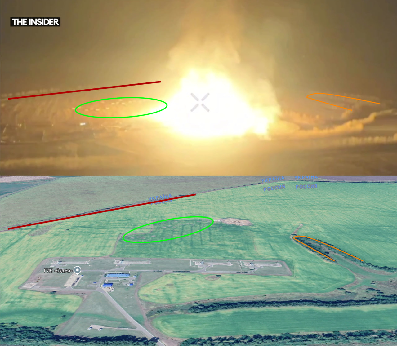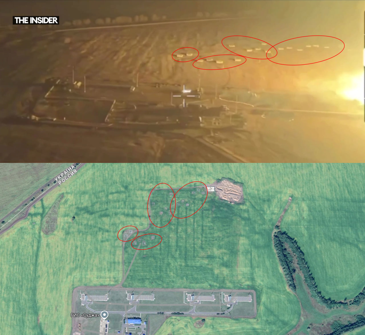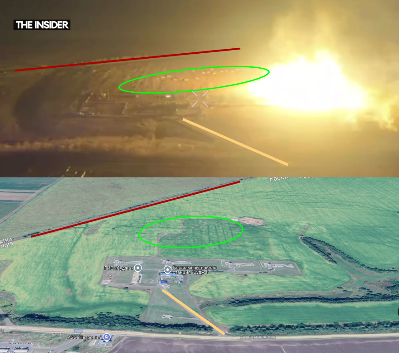 Кроме того, объекты в окрестностях пожара, который снят с дрона, совпадают с уже имеющимися изображениями ГИС «Суджа» — например, фотографиями со спутника в сервисе Google Maps.