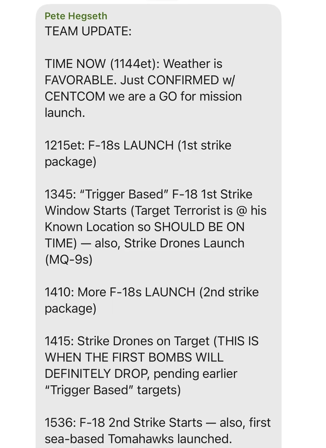 В частности, утром в субботу, 15 марта, участники чата обсуждали операцию США в Йемене в режиме реального времени. В 11:44 Хегсет отправил в чат сообщение под заголовком “TEAM UPDATE” («ОБНОВЛЕНИЕ ДЛЯ КОМАНДЫ»), в котором были подробно расписаны планы ударов американских ВС. The Insider приводит перевод всех сообщений с этого момента.
