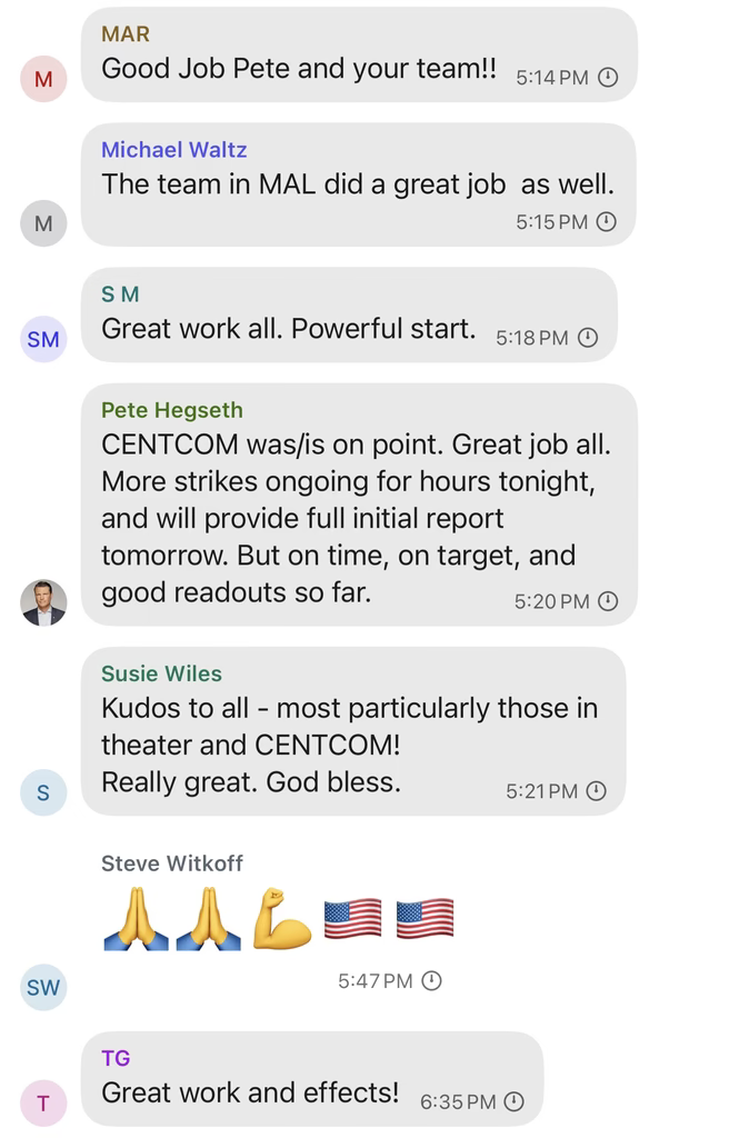 После этого участники чата начали поздравлять друг друга с успешным началом операции. Глава Пентагона Пит Хегсет также написал: «CENTCOM сработал безупречно. Отличная работа, команда. Удары продолжаются и будут идти еще несколько часов сегодня ночью. Завтра будет представлен первый отчет. Всё точно по цели, и уже есть хорошие данные»