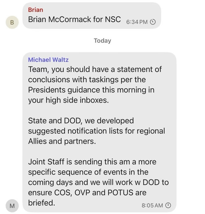 Издание The Atlantic, чьего главного редактора по ошибке добавили в чат американских чиновников в Signal, опубликовало скриншоты переписки, в которой обсуждались удары ВС США по хуситам. Министр обороны Пит Хегсет ранее утверждал, что в чате не было речи ни о каких военных планах.
