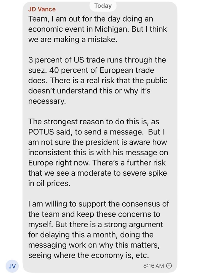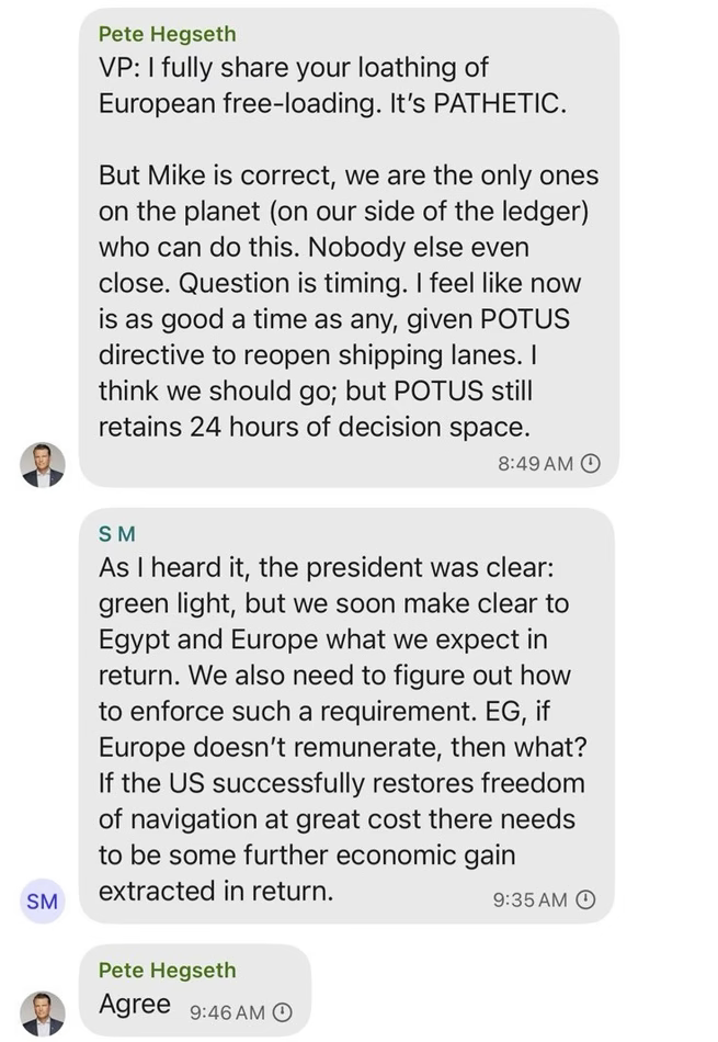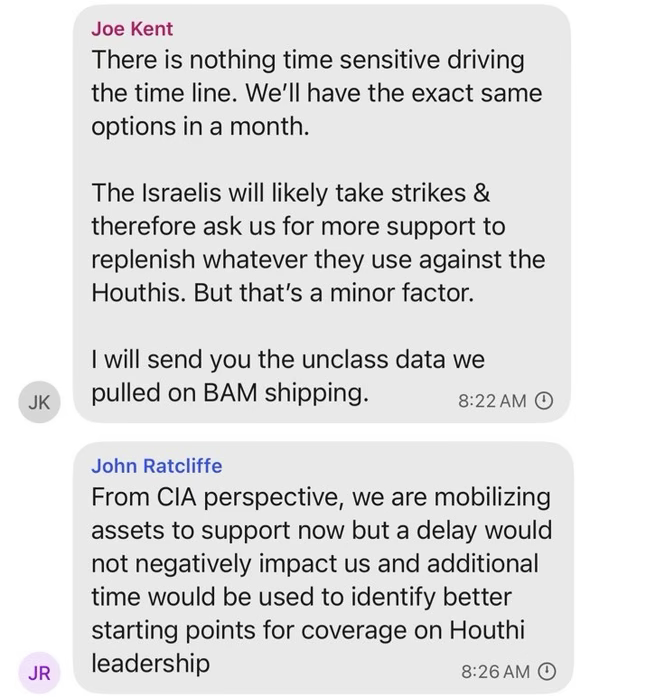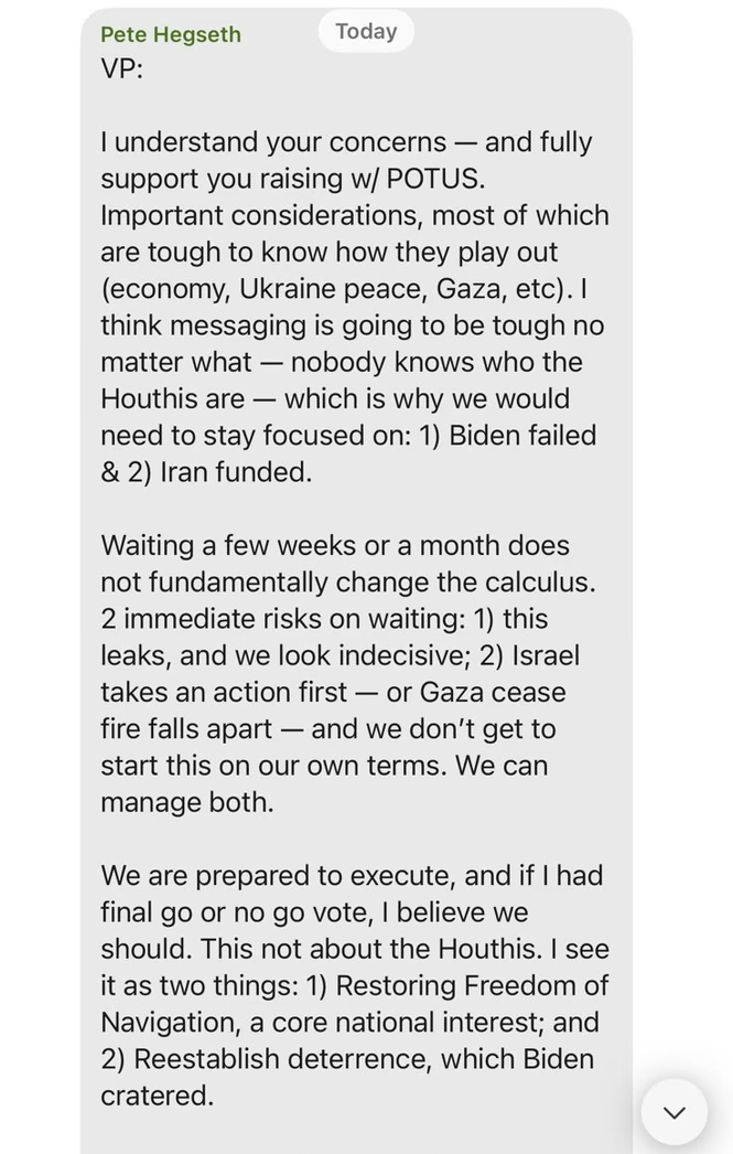 Перед ударами, судя по сообщениям, участники переписки обсуждали целесообразность бомбардировки, а также ее возможные экономические последствия. Например, в одном из сообщений Джей Ди Вэнс пишет: «Команда, сегодня я в Мичигане на экономическом мероприятии. Но думаю, мы совершаем ошибку. Через Суэц проходит 3% торговли США и 40% торговли Европы. Существует реальный риск, что общественность не поймет, зачем это нужно». После недолгой дискуссии он отвечает Хегситу: «@Pete Hegseth, если ты считаешь, что надо действовать, — давай сделаем это. Мне просто надоело каждый раз спасать Европу».