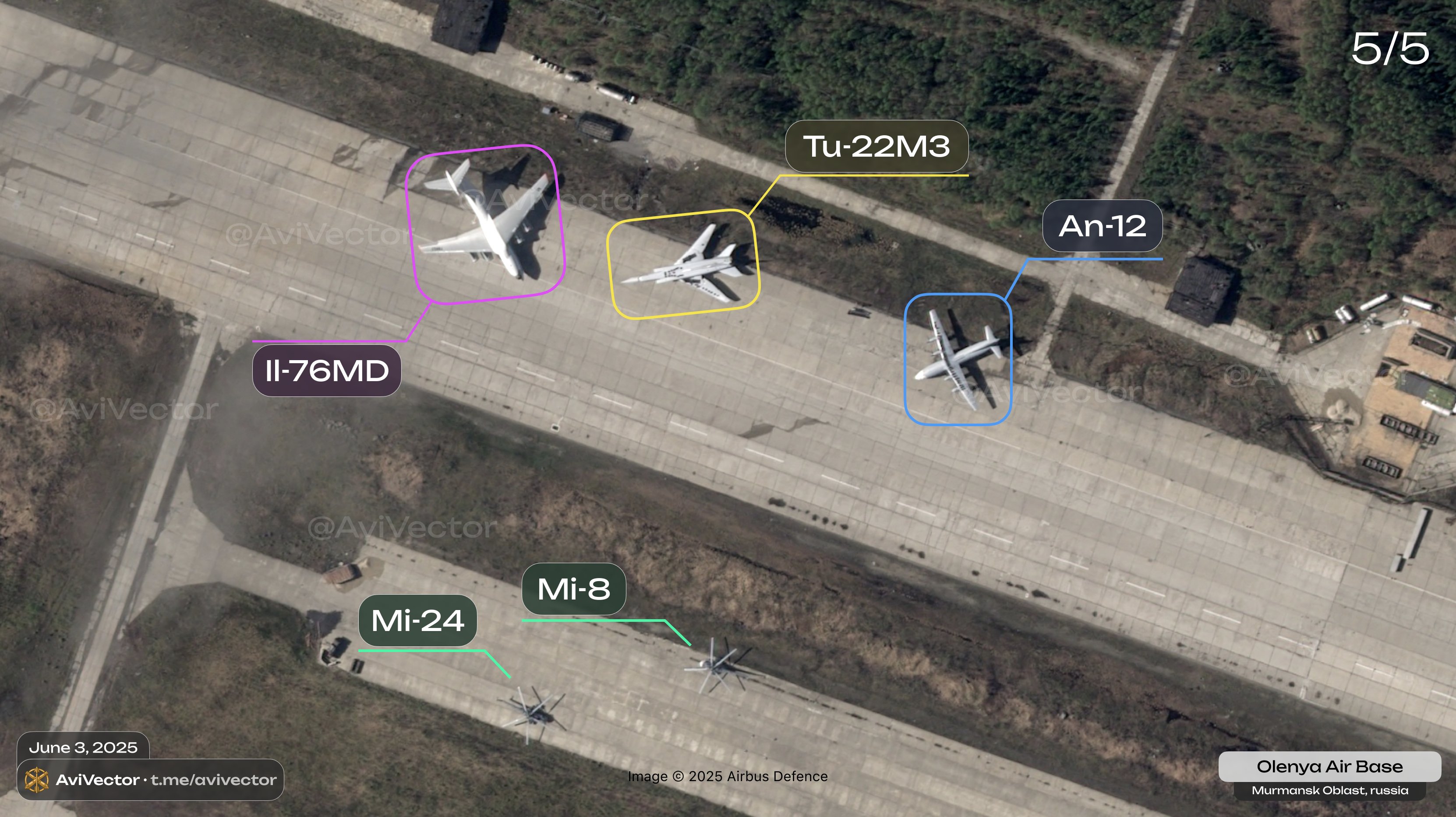 На снимке с SAR-спутника за 2 июня, который публикуют украинские военные аккаунты в соцсетях, также зафиксировано уничтожение четырех российских бомбардировщиков Ту-95 и одного транспортного самолета Ан-12 на авиабазе Оленья в Мурманской области.