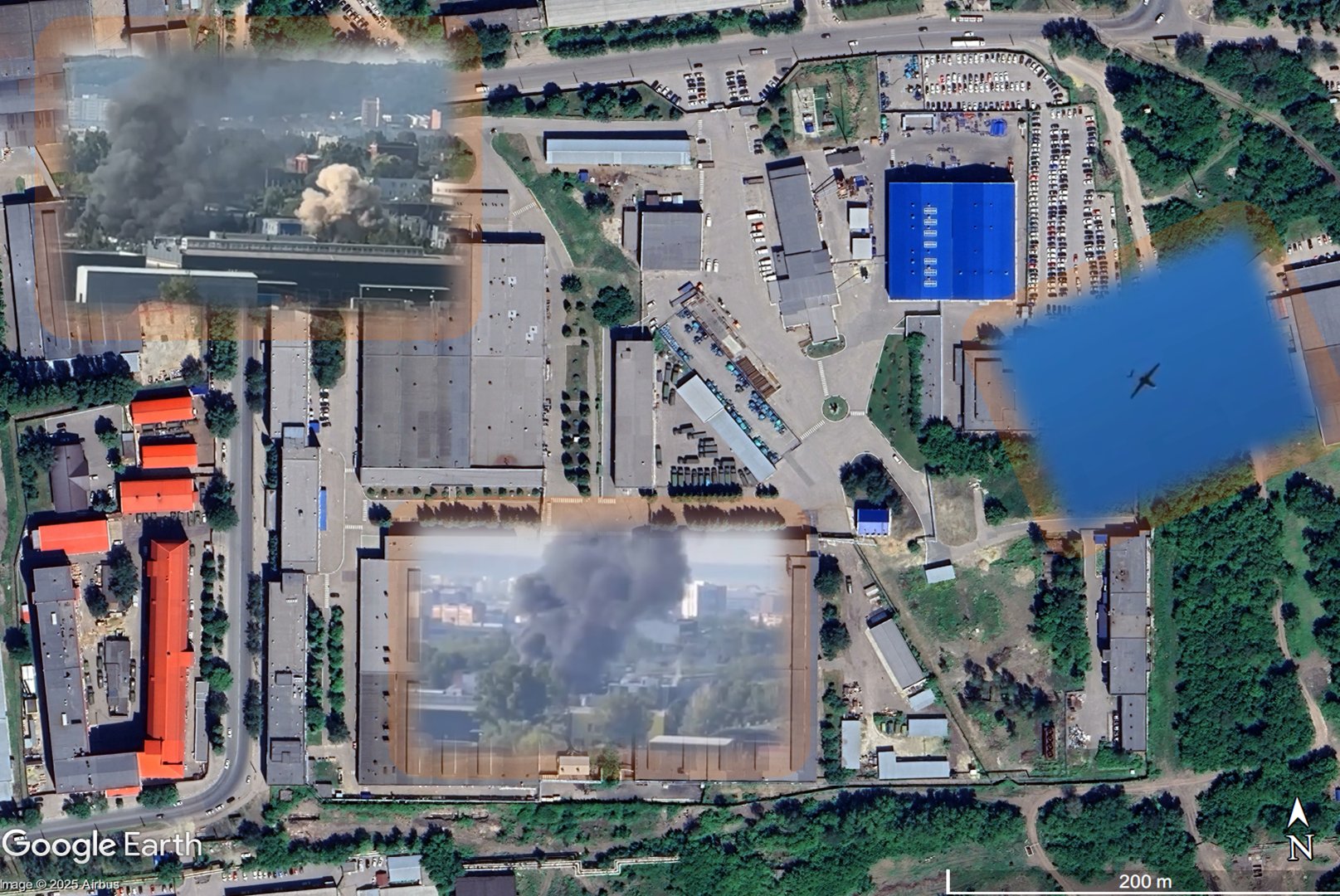 Tatarigami_UA проанализировал спутниковые снимки последствий налета БПЛА на предприятие «Радиозавод» в Пензе. По его предварительной оценке, одно из зданий, вероятно, полностью выведено из строя, второе получило повреждения в результате удара и пожара, третье, предположительно, также пострадало от удара, а четвертое повреждено незначительно.
