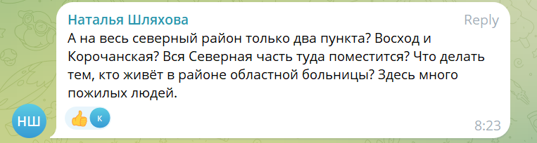 Один из крупных белгородских Telegram-каналов «Белгород № 1» опубликовал список 24 пунктов обогрева, которые планируется развернуть в городе в случае перебоев с теплом и светом. В комментариях многие жители выразили недовольство тем, что такие пункты находятся от их домов слишком далеко и могут не вместить всех желающих. Представители администрации города на это отвечали, что стационарные пункты можно открыть только в тех зданиях, где есть генераторы и автономные котельные: