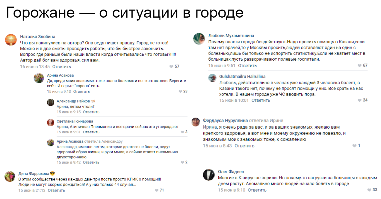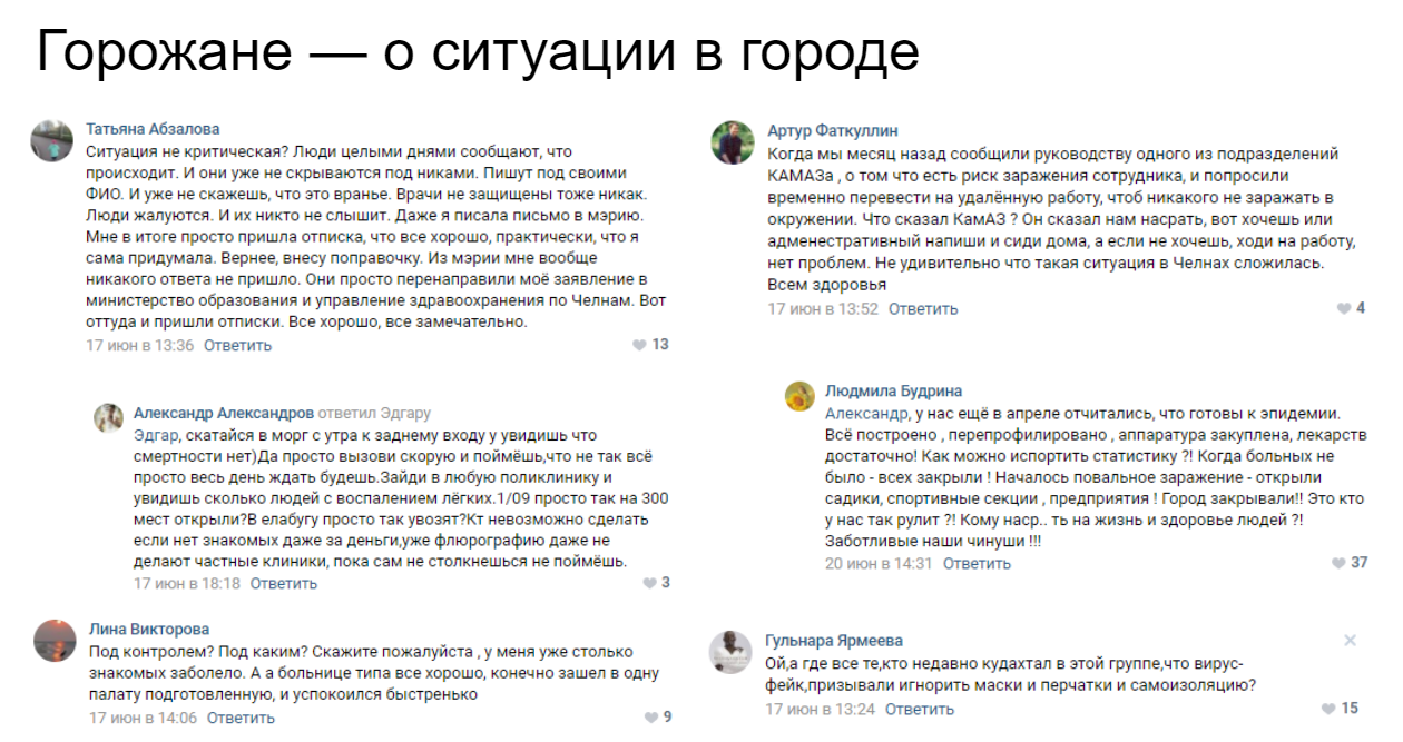 Что пишут люди. Общий лейтмотив сообщений: «ситуация критическая, весь город болеет». Это сообщения не трёх паникёров — это комментарии от десятков людей. В июне практически исчезают комментарии вроде «кто-то знает хоть одного человека, кто болеет этим ковидом?», а когда появляются — собирают урожай явок: «столько знакомых заболело уже», «среди знакомых полно больных и все контактные». По комментариям и постам людей создаётся впечатление, будто весь город кашляет, стоит в очередях в поликлиниках, с лихорадкой под 40 ждёт скорую сутками и болеет пневмонией.
