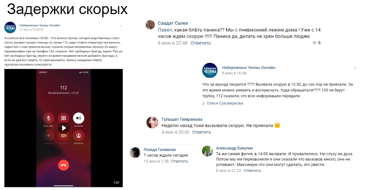 Коллапс. Больше всего жалоб — именно на ожидание скорых. Люди ждут до глубокой ночи, по 10−14 часов. Кто-то отправляется в больницу сам, кто-то и вовсе не дожидается (но эти случаи единичны). Впрочем, судя по свидетельствам, на экстренные вызовы вроде инфарктов, происшествий с детьми и неотложных состояний скорые приезжают оперативно.